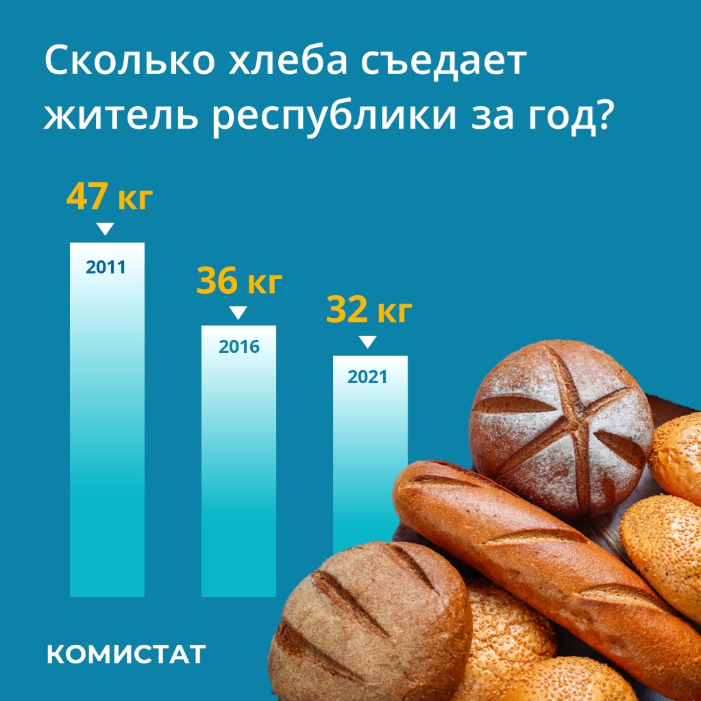 За 2021 г. каждый житель республики съел в среднем 32 килограмма пшеничного и ржаного хлеба, что на 11 % меньше, чем пять лет назад, и на 32 % меньше, чем десять лет назад.