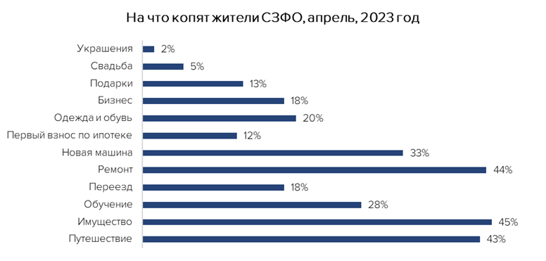 Чаще всего жители Коми планируют потратить накопленную сумму на покупку нового имущества (47% опрошенного населения). На втором месте стоит ремонт в квартире (45%). Третьим по популярности является путешествие (43%). В топ-5 причин для накоплений также вошли обучение (29%) и покупка новой машины (35%).