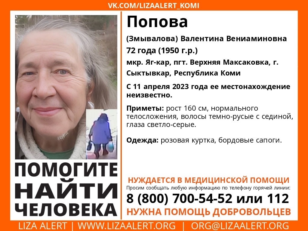 Напомним, о местонахождении В.Поповой 1950 г.р. неизвестно с 11 апреля. Поиски пенсионерки объявил поисковый отряд "Лиза Алерт". Приметы: рост 160 см., нормального телосложения, темно-русые с сединой волосы, светло-серые глаза. Предположительно была одета в голубую куртку, бордовые сапоги, серый берет.