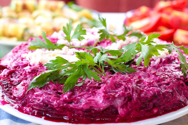 Происходящая из еврейской кухни "Шуба", наряду с оливье и "Мимозой", — участница триумвирата зимних майонезных салатов. Утверждается, что существенных отличий от оригинала в составе лишь два: появился майонез, а вареная картошка сменила натертое яблоко. Нынешний формат перемазанных "провансалем" слоев измельченного лука, кубиков сельди, вареной моркови, картошки и свеклы появился еще в довоенные годы, но устоялся только в 1970-е.