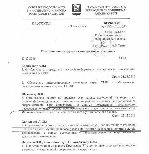 После проверки, инициированной прокуратурой Татарстана, обнаружилось, что поручение главы Зеленодольского района об изъятии несовершеннолетних детей из семей с долгами по ЖКХ реализовано не было. Надзорный орган не нашел фактов отобрания детей в связи с наличием задолженности по оплате коммуналки. При этом начальнику отдела опеки и попечительства Зеленодольского района было объявлено предостережение о недопустимости нарушений федерального законодательства и о возможной административной и уголовной ответственности.