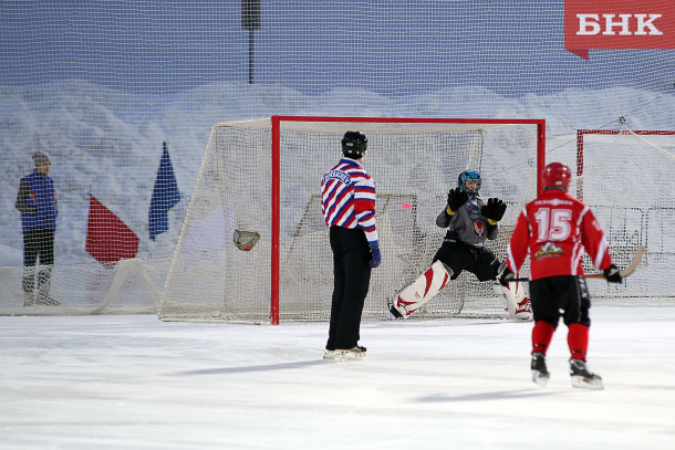 Одержав четыре победы в финале, сыктывкарцы обеспечили себе одно из двух мест, дающих право выступить в Суперлиге. Фото Виктора БобыряВновь выйдя на лед республиканского стадиона в роли номинальных гостей, "Строитель" начал поединок против удмуртского коллектива довольно невзрачно, словно соответствуя сыктывкарской погоде. В дебюте встречи под моросящим дождем хозяевам льда пришлось обороняться от атак воткинцев, особо не блиставших как по ходу регулярного чемпионата, так и финального турнира. К четвертой игре клуб "Знамя-Удмуртия" подошел, имея на своем счету победу, ничью и поражение.