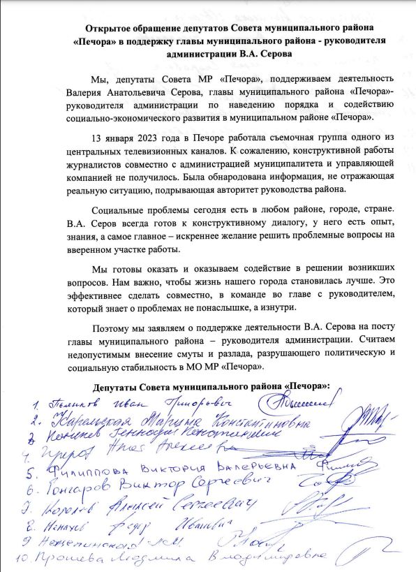 "Мы, депутаты Совета МР "Печора", поддерживаем деятельность Валерия Анатольевича, главы муниципального района "Печора" - руководителя администрации, по наведению порядка и содействию социально-экономического развития в муниципальном районе "Печора".
