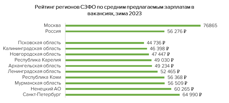 В среднем по СЗФО работодатели предлагают на данный момент доход почти в 59 000 рублей, по России порядка 56 000 рублей. Лидером рейтинга по наибольшей медианной зарплате в СЗФО стал Санкт-Петербург - средняя предлагаемая зарплата в январе здесь составила почти 65 000 рублей. На втором месте среди регионов СЗФО по уровню зарплат - Ненецкий АО, где средняя предлагаемая зарплата составляет 60 200 рублей. На третьем месте по уровню зарплатного предложения находится Мурманская область - 56 500 рублей. С другой стороны, есть также 6 регионов СЗФО, где средняя предлагаемая зарплата даже ниже, чем средняя по стране: Псковская, Новгородская, Калининградская, Архангельская, Ленинградская область, а также Карелия.
