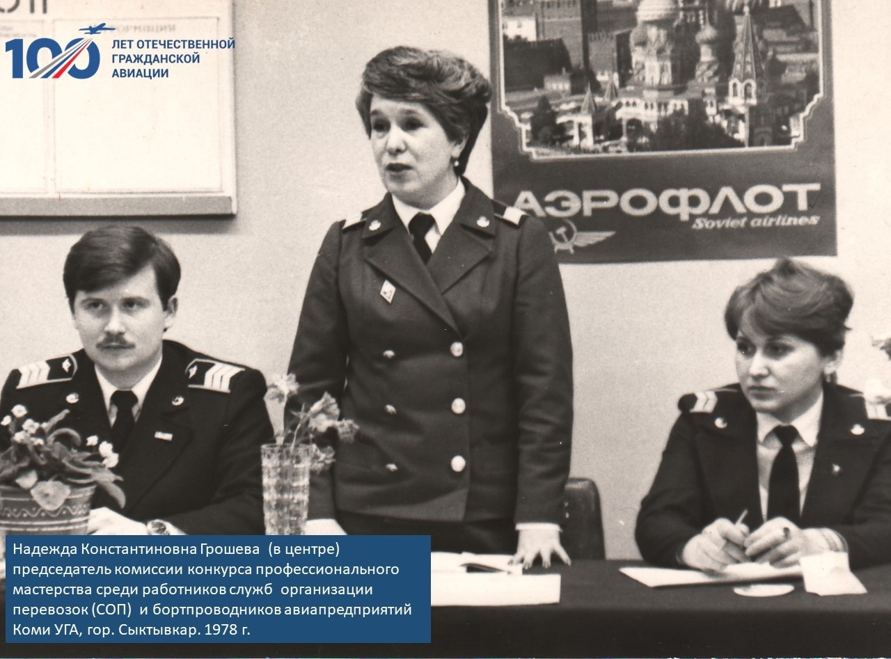 В бурно развивающейся республике в 70-х - 80-х годах двадцатого столетия она непосредственно курировала организацию обслуживания пассажиров и коммерческой клиентуры в вводимых в эксплуатацию новых аэропортах и аэровокзалах - в Сыктывкаре, Ухте, Усинске, Вуктыле, Инте, Ижме, Усть-Цильме, Воркуте. В период пикового освоения на территории республики новых нефтегазоносных месторождений и лесных богатств, организация вахтовых авиаперевозок была сферой ответственности именно Надежды Грошевой. Под её непосредственным контролем были организованы первые международные рейсы в Болгарию: Сыктывкар - София и Сыктывкар - Варна.