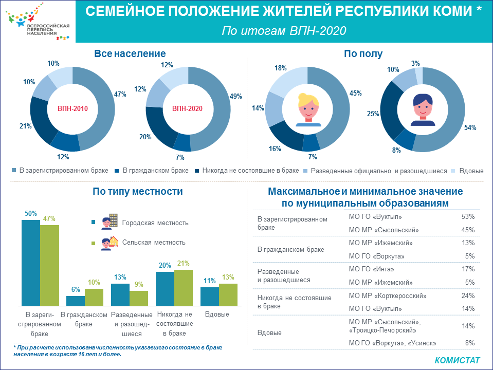Комистат представил данные о семейном положении жителей Коми по итогам Всероссийской переписи населения 2020 года.