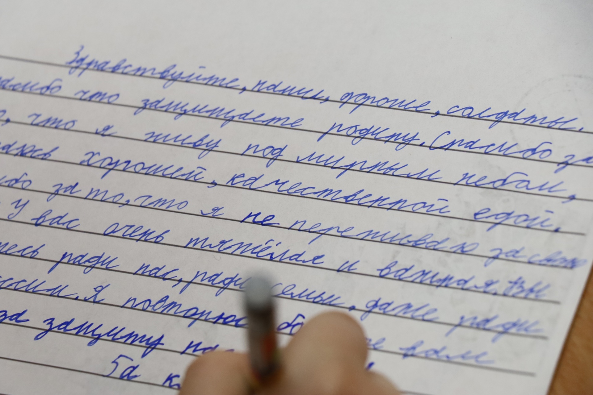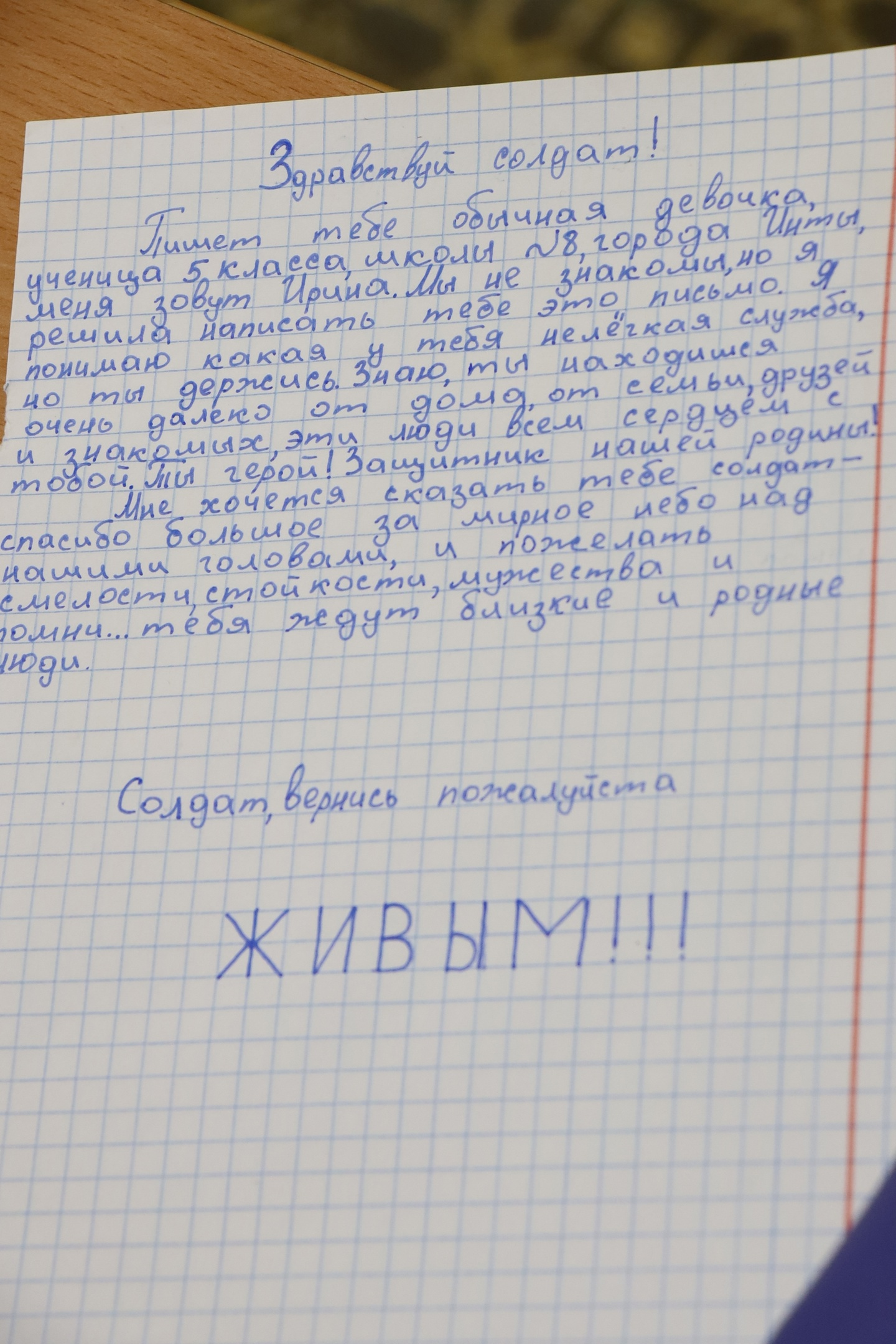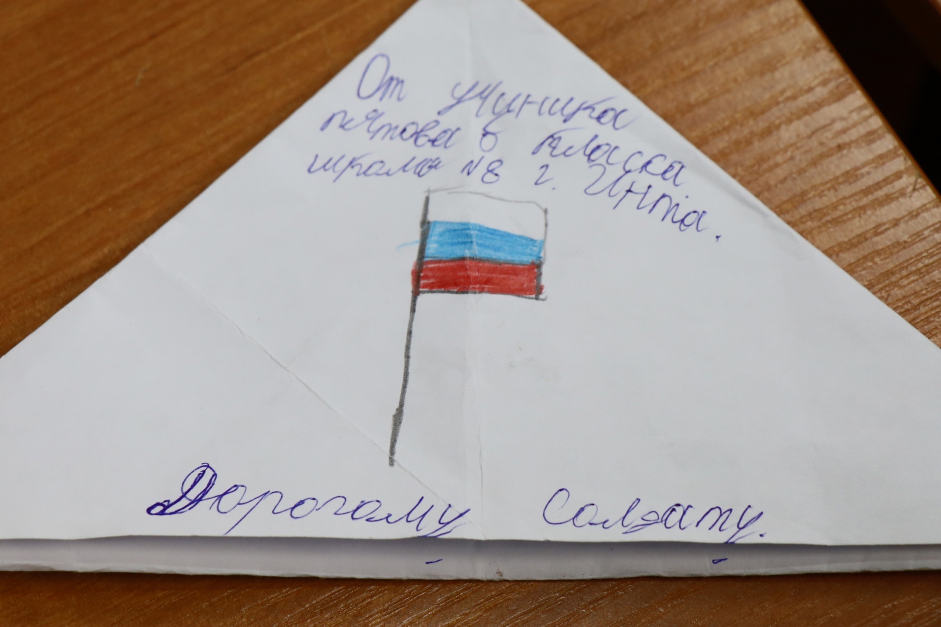 "Здравствуй, дорогой солдат, - пишет Мария Дудырина, ученица 4 класса, - Благодарю тебя за твой нелегкий солдатский труд и защиту нашей Родины. Я горжусь тобой и восхищаюсь твоими подвигами. Хочу пожелать тебе успехов, скорейшей победы и благополучного возвращения домой к своей семье. Я знаю, тебе сейчас тяжело, твоя жизнь ежесекундно подвергается риску, и тебе, как никогда, важно чувствовать поддержку. Знай, мы любим и ждем тебя".