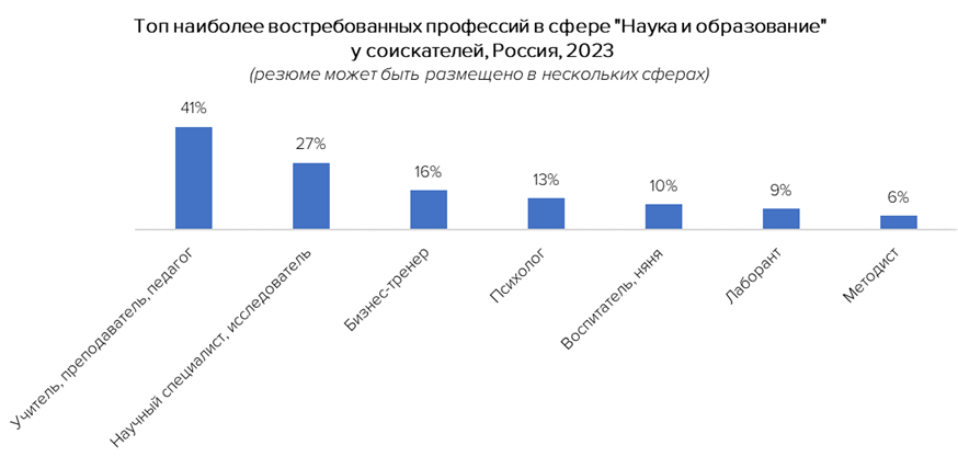 Судя по числу резюме, россиян интересует работа в научной и образовательной сфере в качестве учителей, преподавателей, научных специалистов и исследователей. Также в топ самых популярных у соискателей входят профессии бизнес-тренера и психолога.