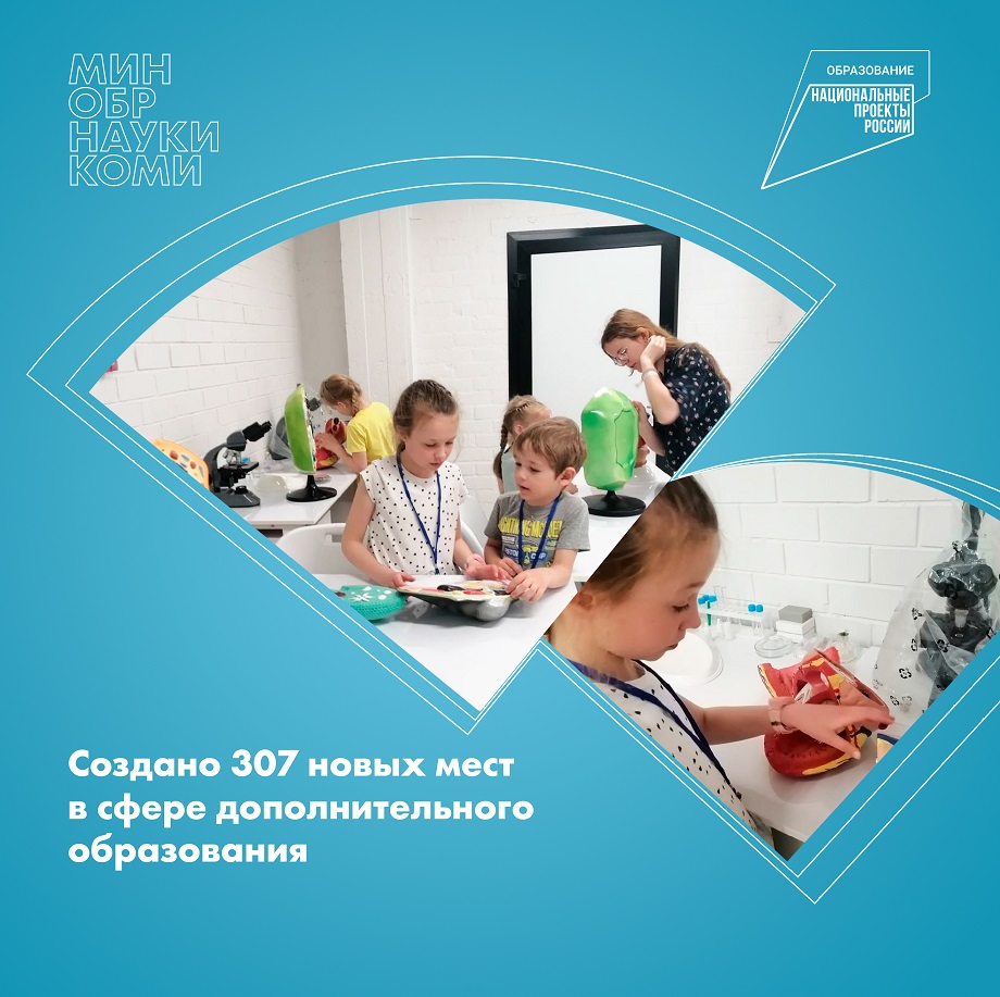 Создано 307 новых мест в дополнительном образовании на базах образовательных организаций МОГО "Усинск", МОГО "Ухта", МОМР "Троицко-Печорский", МОМР "Сыктывдинский" и ГАУДО РК "Республиканский центр детей и молодежи". На реализацию было предусмотрено 3 млн 779,8 тыс. рублей, в т. ч. 3 млн 590,8 тыс. рублей - средства федерального бюджета.