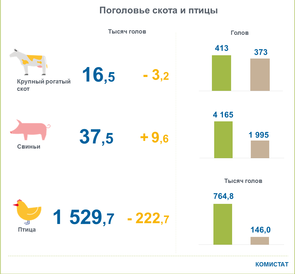 В расчете на одну организацию в 5 раз увеличилось поголовье птицы - до 765 тыс. голов, свиней в два раза, до 4 тыс. Количество крупного рогатого скота выросло на 11% и составило 413 голов.