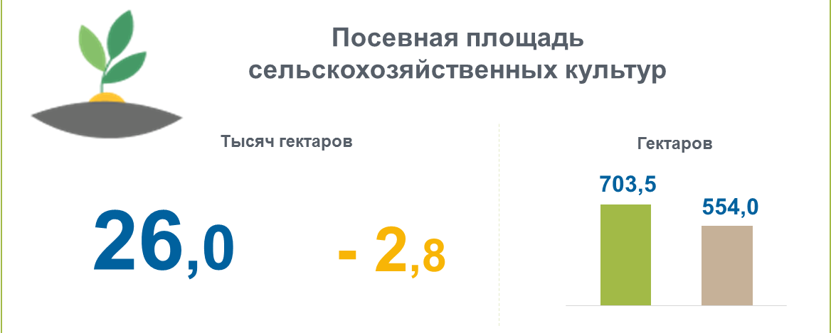 Под урожай в 2021 году сельхозорганизации засеяли 26 тыс. га посевных площадей. Животноводческая направленность деятельности организаций определяла структуру посевов. Почти 100% посевов приходилось на кормовые культуры.