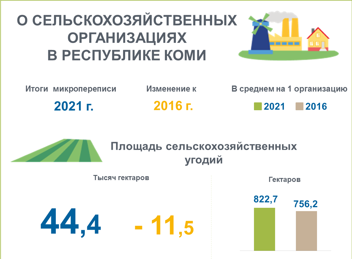 Согласно сельскохозяйственной микропереписи 2021 года в республике насчитывалось 54 с/х организации. Их количество уменьшилось, однако по большинству показателей отмечалось укрупнение сельхозорганизаций.