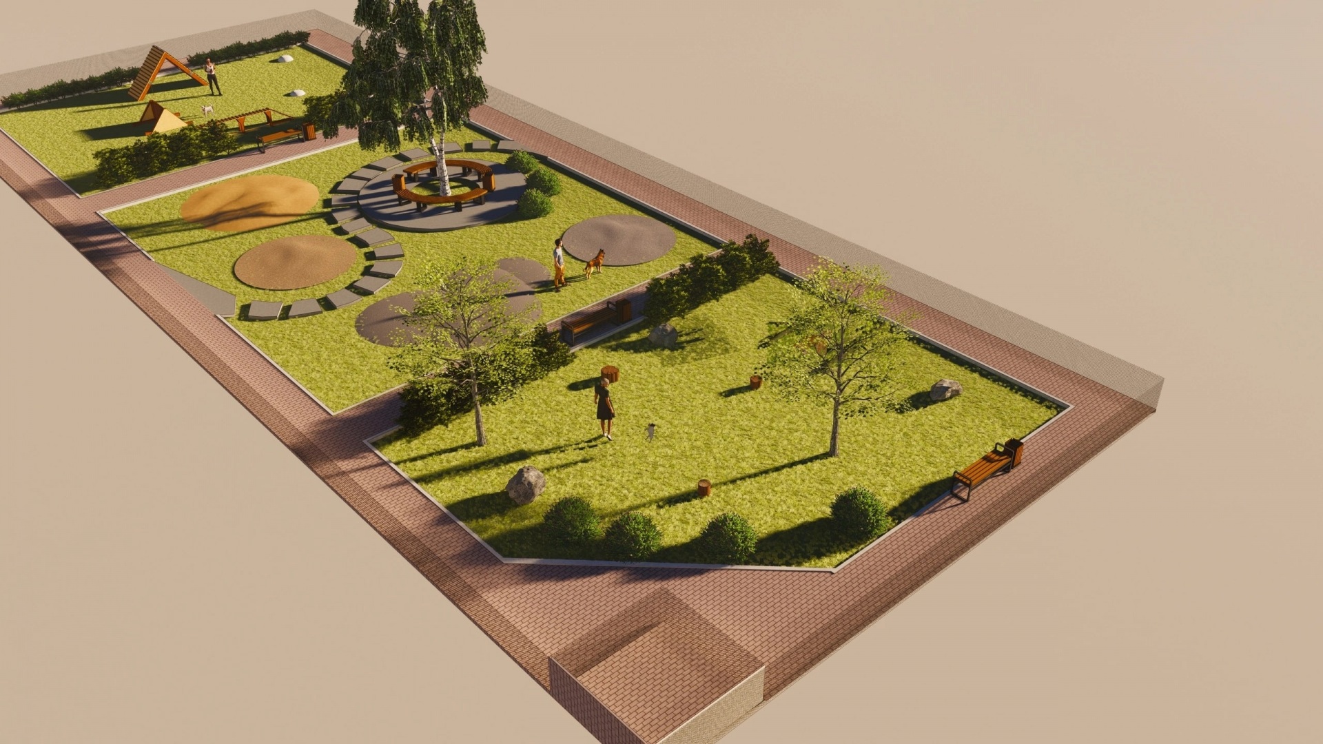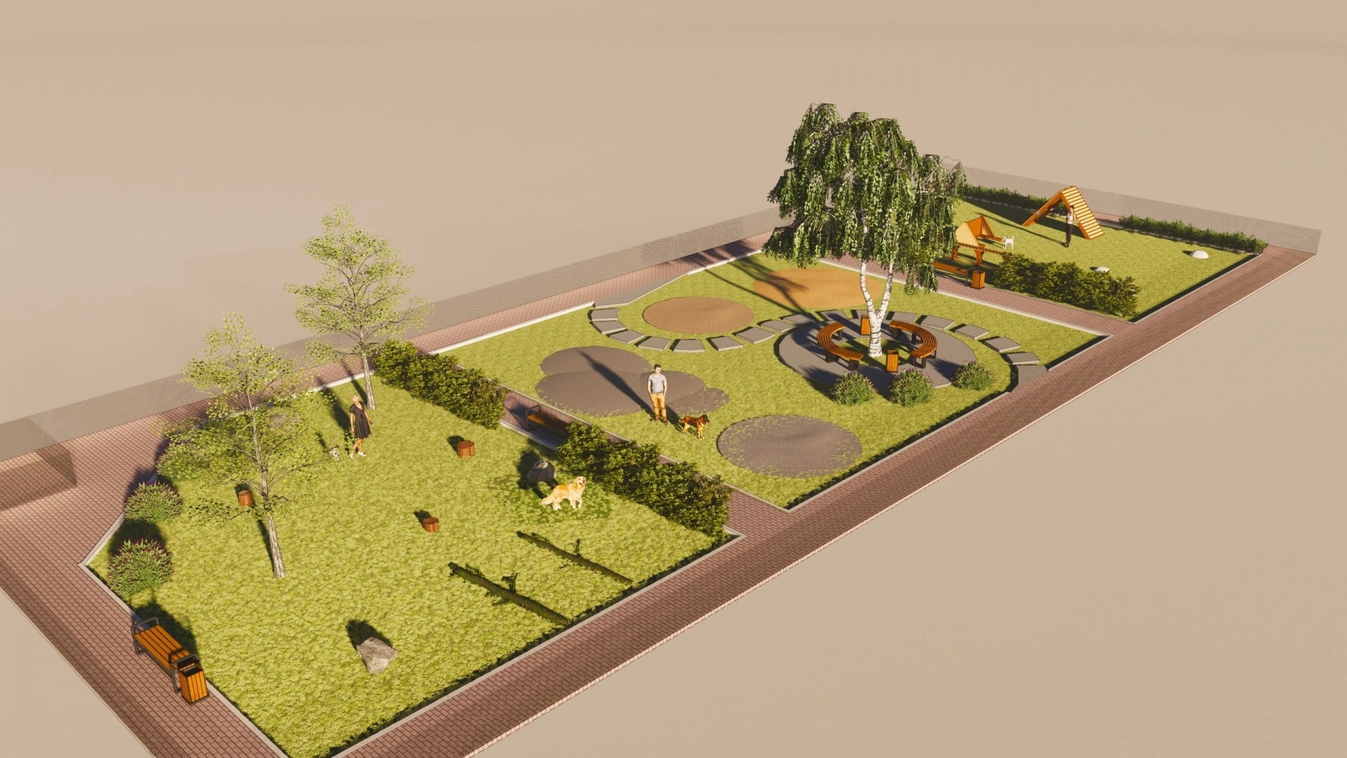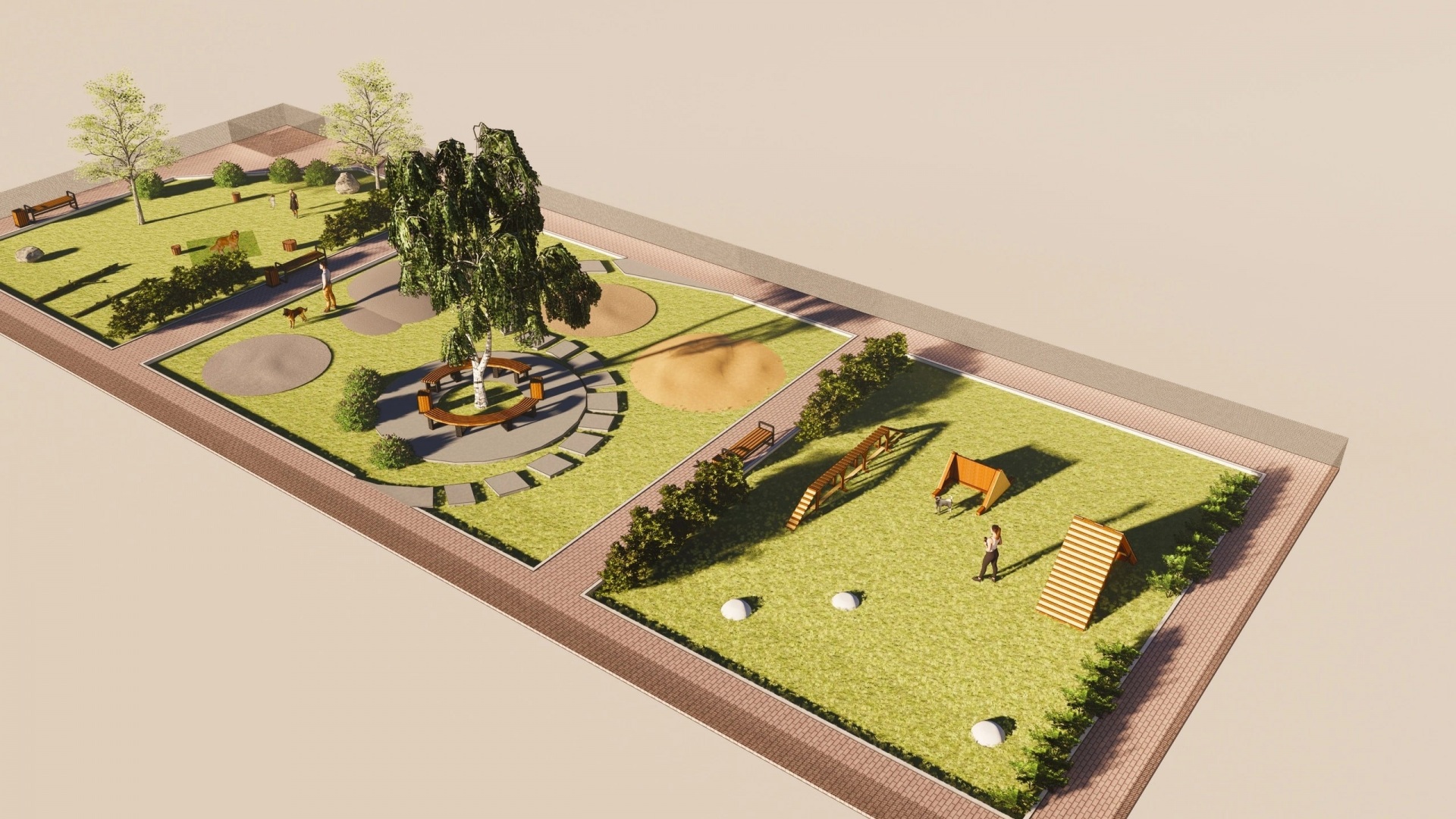 Третья локация - для физических нагрузок и занятий спортом. На газоне расположены самые распространенные и менее опасные снаряды: бум, горка и меняющий уровень высоты барьер. Также есть полусферы, которые послужат прекрасными снарядами для разминки, растяжки, повышения уровня координации собаки. По всему периметру вдоль забора также есть дорожки, а локации разделены кустарником", - рассказывает о проекте Анна Попова.