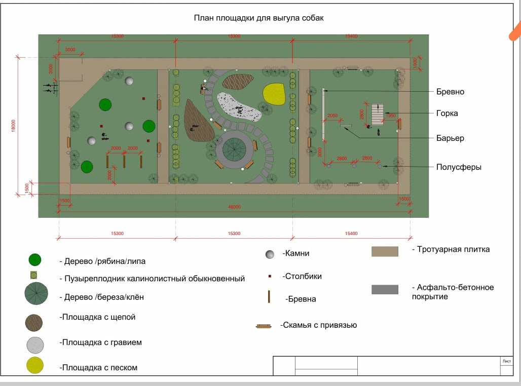 Кинолог предлагает территорию парка полностью огородить забором, для безопасного входа обустроить "тамбур": если кто-то входит в парк со своей собакой, другие не сбегут. Парк визуально и функционально поделен на зоны: выгул, прогулка, дрессировка.