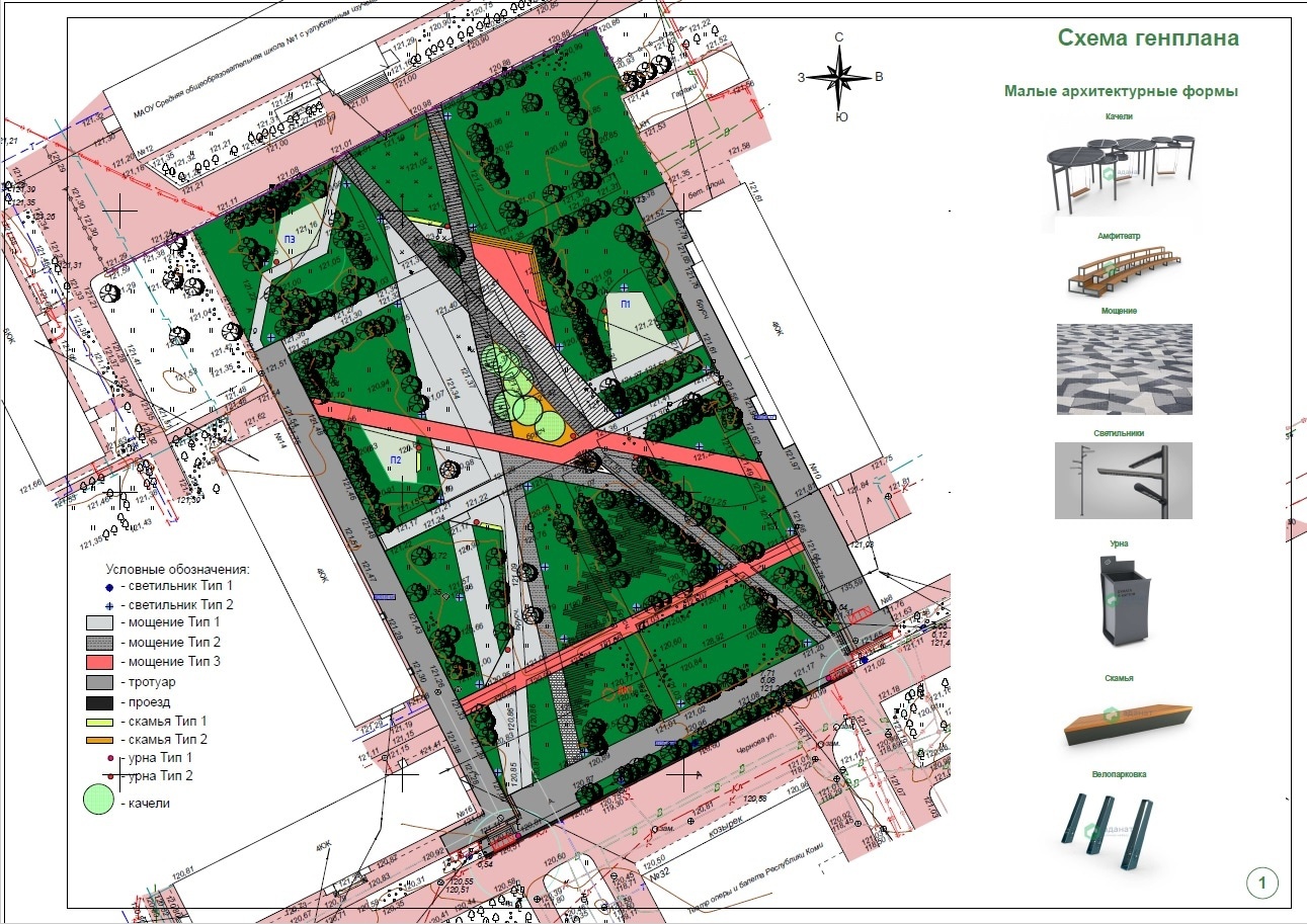 Также будут установлены малые архитектурные формы, среди них качели и амфитеатр, светильники, скамейки, урны и велопарковка.