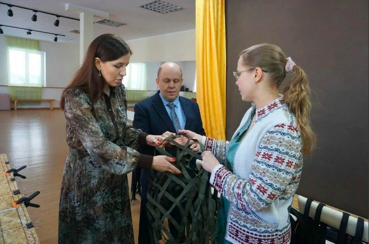 Заместитель председателя Правительства Коми Алексей Просужих с сенатором Ольгой Епифановой и заместителем секретаря Коми Регионального отделения партии "Единая Россия" Ольгой Сычуговой оценили масштаб работы волонтеров российского движения "Золотые руки Ангела" в Сыктывкаре, изготавливающих тактические носилки для спасения раненых бойцов.
