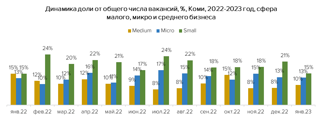 Лидерами по спросу у местных работодателей из микробизнеса по итогам прошлого и в начале 2023 года являются представители производственной сферы (+24% новых вакансий в начале этого года по сравнению с началом 2022). Компаниям Коми из сегмента Small или малому бизнесу больше всего не хватает на данный момент рабочего (+26%) и обслуживающего персонала (+11%). Работодателям из сегмента Medium особенно нужны строители (+12%) и работники транспортной сферы (+17%).