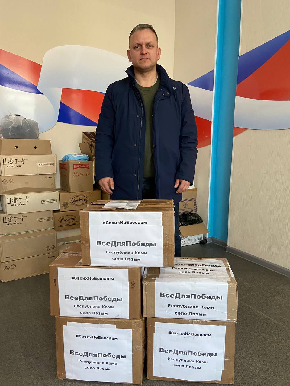"Мы передали блиндажные свечи, теплые носки, чай, кофе, вафли, конфеты, сгущенку, футболки, тельняшки, продукцию местной птицефабрики и медикаменты", - рассказал депутат Госсовета Коми, секретарь Усть-Вымского местного отделения партии Андрей Мельник.