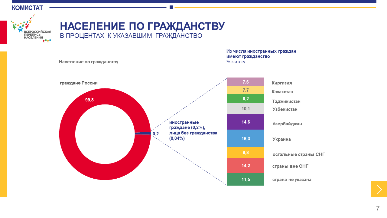 По итогам Всероссийской переписи населения 2020, на территории республики 99,8% населения составляют граждане России. В Коми живут и граждане других стран, их количество составляет 0,2% от общей численности граждан.