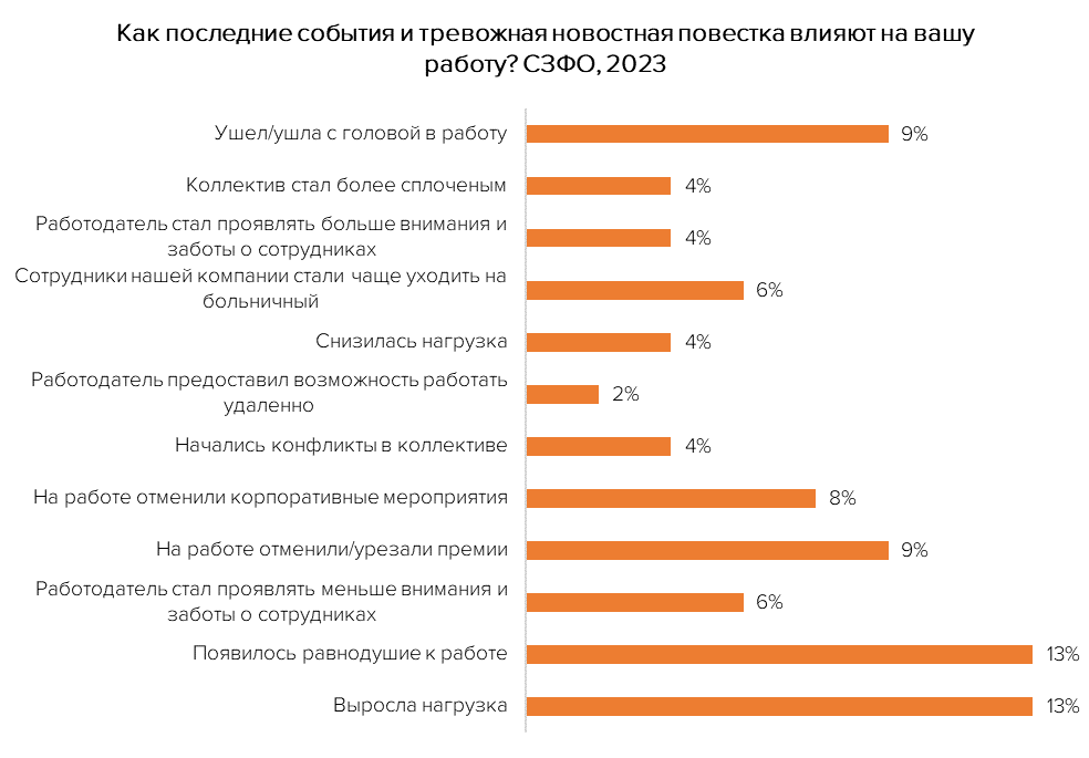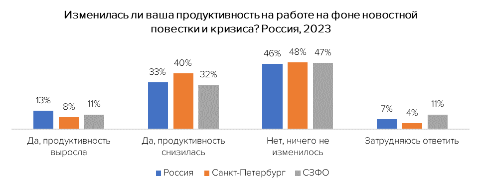 Масштабный опрос, проведенный среди работающих жителей СЗФО, показал, что у 32% опрошенных на фоне последних событий лет, кризиса снизилась продуктивность на работе. Ещё 11%, наоборот, заявили, что у них вырос уровень работоспособности, а 47% не почувствовали никаких изменений в своём состоянии, остальные затруднились ответить.