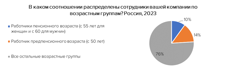 Важно, что в 78% случаев работодатели признают, что в их компании работают сотрудники пенсионного или предпенсионного возраста. В каждой пятой (19%) компании таких работников нет. При этом на вопрос "В каком соотношении распределены сотрудники вашей компании по возрастным группам?" лишь в 10% случаев работодатели указали, что у них трудятся работники пенсионного возраста (с 55 лет для женщин и с 60 для мужчин). В 14% компаний есть работники предпенсионного возраста (с 50 лет). Остальные 76% работников приходятся на другие более молодые возрастные группы работников. Таким образом, исследование показывает, что работники старшего возраста есть в большинстве российских компаний, но представлены они совсем в малом количестве.