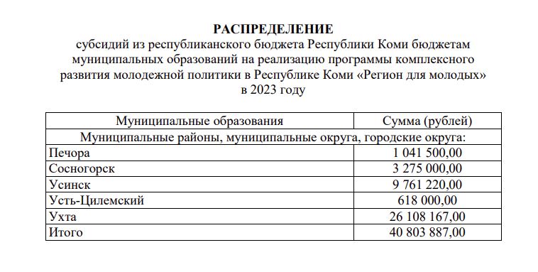 Средства будут направлены в пять муниципалитетов: Печору, Сосногорск, Усинск, Ухту и Усть-Цилемский район. Среди них распределят 40,8 млн рублей.