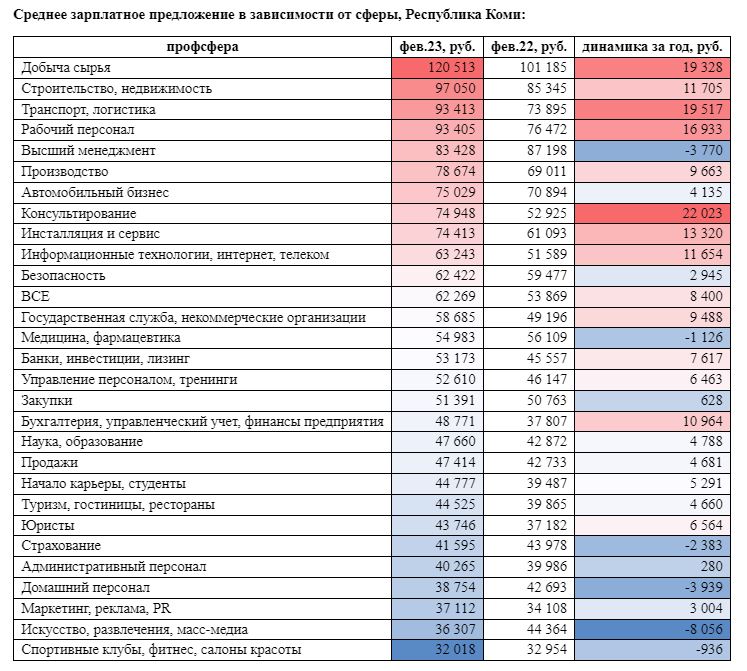 "В разрезе профессиональных областей больше всего в Коми предлагают работодатели из сферы "Добыча сырья" (120 513₽), здесь доход вырос за год на 19 328₽. На втором месте по уровню высоких зарплат сфера "Строительство", в республике здесь можно заработать до 97 050₽ (рост за год на 11 705₽). На третьем месте - "Транспорт", здесь доход на уровне 93 4ё3₽ (+19 517₽). При этом сильнее всего рост зарплат за год наблюдается в консультировании (+22 023₽, до 74 948₽). Не повезло с динамикой зарплат соискателям из сферы искусства: за год работодатели из данной области сократили зарплатные предложения на -8 056₽, до 36 307₽", - комментирует Мария Бузунова, руководитель пресс-службы hh.ru СЗФО.