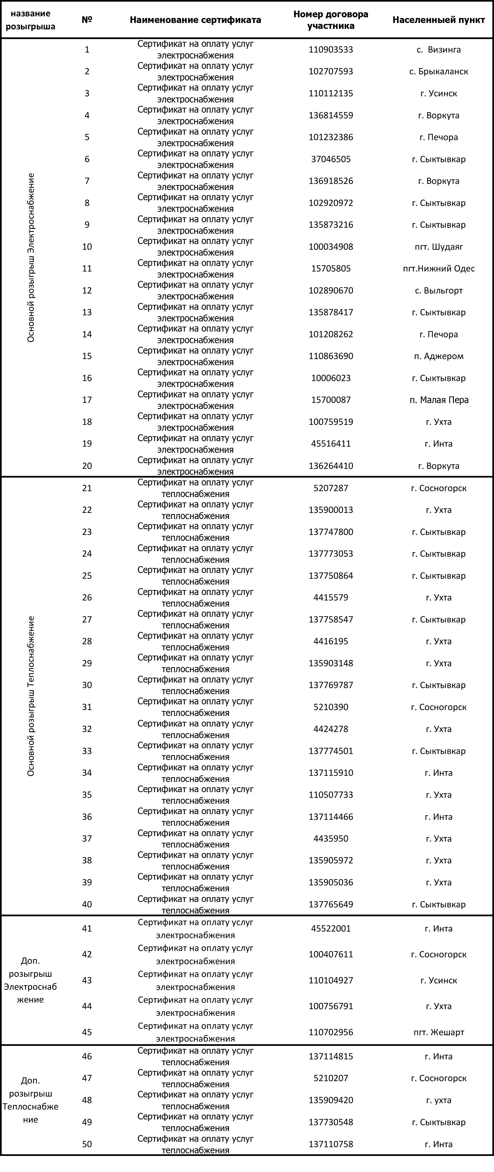 "Коми энергосбытовая компания" разыграла 50 сертификатов номиналом 4 000 рублей на оплату электроэнергии и теплоснабжения в рамках акции "В Новый год - без долгов". Победителей определили с помощью генератора случайных чисел.
