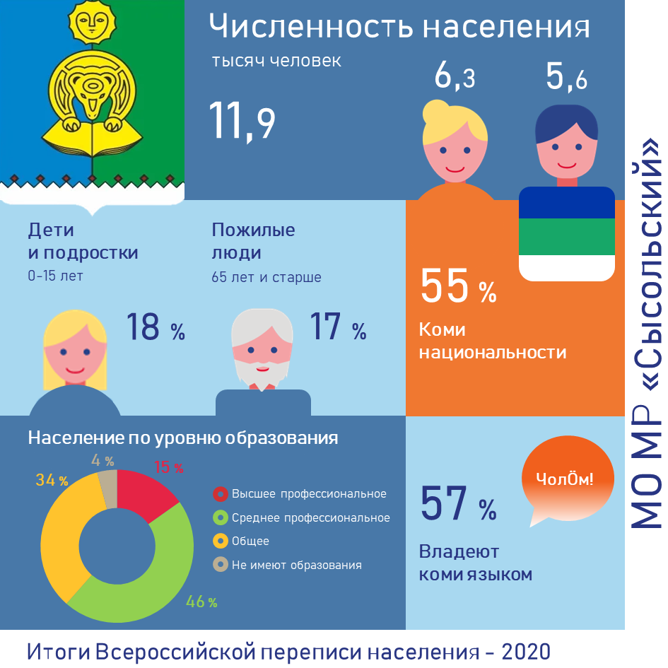 В Сыктывкаре 19% жителей причисляют себя к коми национальности, владеют языком 10%. Также в столице республики насчитывается больше детей и подростков, чем пожилых людей от 65 лет.