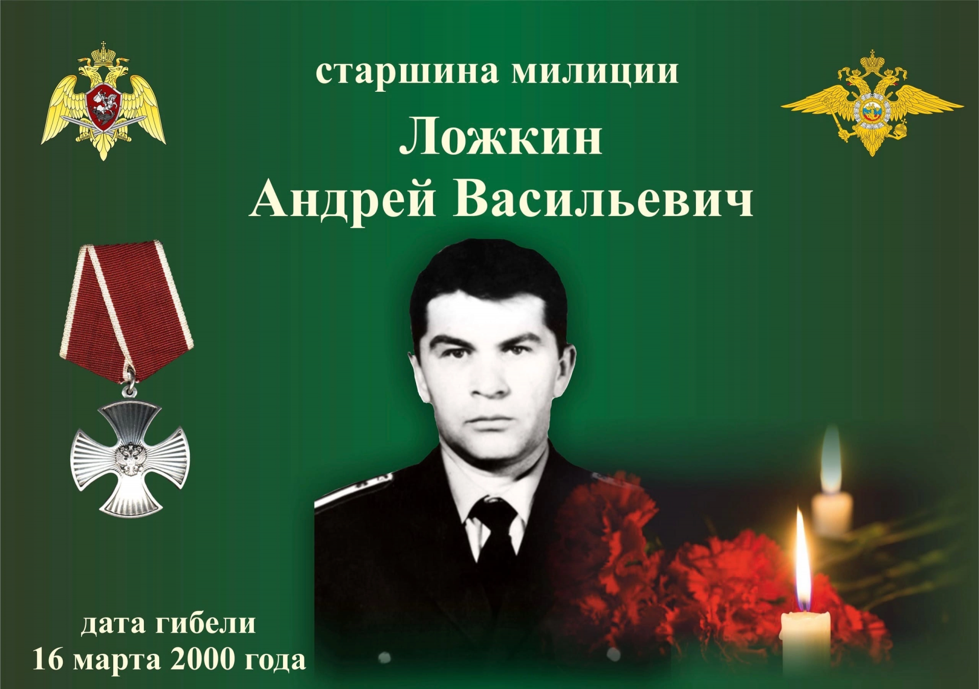 Милиционер-водитель моторизованного взвода ОМОН МВД Республики Коми старшина милиции Андрей Ложкин погиб 16 марта 2000 года в зоне вооруженного конфликта на территории Северо-Кавказского региона от пулевого ранения.