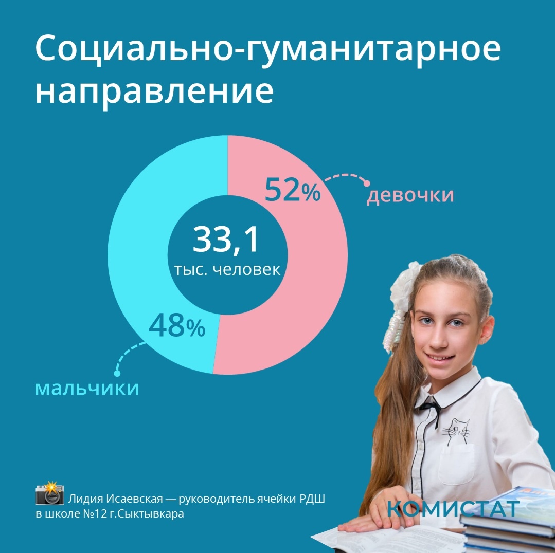 На втором месте по популярности направлений дополнительного детского образования находится социально-гуманитарное. Занятия в основном посещают девочки - 52%. Всего по этому направлению в республике занимаются более 33 тыс. детей.